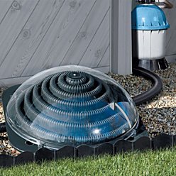 Heat your above-ground pool the environmentally-friendly way with this Solar Pool Heater. Extend your swim season from spring to fall by warming your pool water with this solar pool heater, and save up to 0 per month in energy costs! (Based on cost of heating a 6000-gallon pool by 4 degreesF.) Your pool's pump circulates the water through the solar cells of this above-ground pool heater; the sun-heated water is then delivered back into your pool. Extend the legs under the solar pool heater and adjust its angle for maximum sun exposure. For bigger pools or faster heating, you can link together two or more solar pool heaters. (See chart below for more information.) Sturdy plastic Solar Pool Heater includes 2 sections of hose and stainless steel hose clamps; fits 1-1/4" to 1-1/2" flexible hose fitting. This above-ground pool heater also has a protective cloth cover. Comes with a 1 year manufacturer guarantee.For details on how long it takes to heat a pool using the Solar Pool Heater, check out our Solar Pool Heater Chart. Read more...